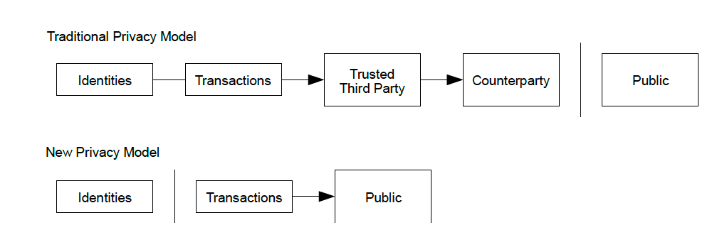 The traditional banking model achieves a level of privacy by limiting access to information to the parties involved and the trusted third party. The necessity to announce all transactions publicly precludes this method, but privacy can still be maintained by breaking the flow of information in another place: by keeping public keys anonymous. The public can see that someone is sending an amount to someone else, but without information linking the transaction to anyone. This is similar to the level of information released by stock exchanges, where the time and size of individual trades, the "tape", is made public, but without telling who the parties were.