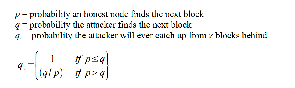 Given our assumption that p > q, the probability drops exponentially as the number of blocks the attacker has to catch up with increases. With the odds against him, if he doesn't make a lucky lunge forward early on, his chances become vanishingly small as he falls further behind.