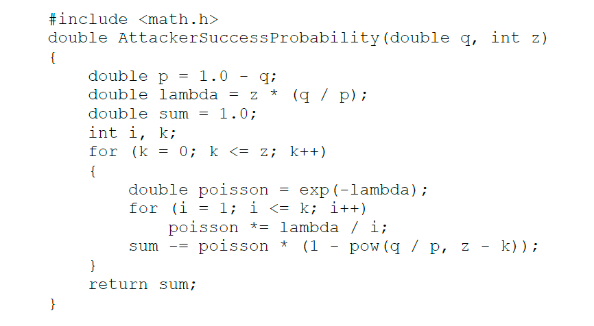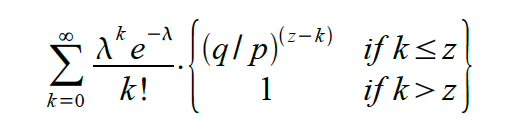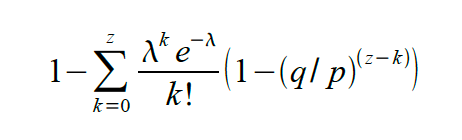 To get the probability the attacker could still catch up now, we multiply the Poisson density for each amount of progress he could have made by the probability he could catch up from that point: