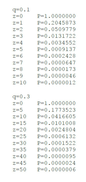 Running some results, we can see the probability drop off exponentially with z.