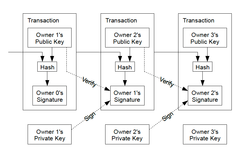 We define an electronic coin as a chain of digital signatures. Each owner transfers the coin to the next by digitally signing a hash of the previous transaction and the public key of the next owner and adding these to the end of the coin. A payee can verify the signatures to verify the chain of ownership.