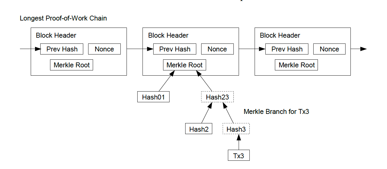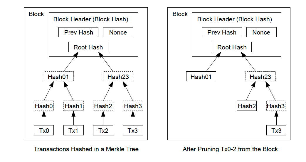 Once the latest transaction in a coin is buried under enough blocks, the spent transactions before it can be discarded to save disk space. To facilitate this without breaking the block's hash, transactions are hashed in a Merkle Tree [7][2][5], with only the root included in the block's hash. Old blocks can then be compacted by stubbing off branches of the tree. The interior hashes do not need to be stored.